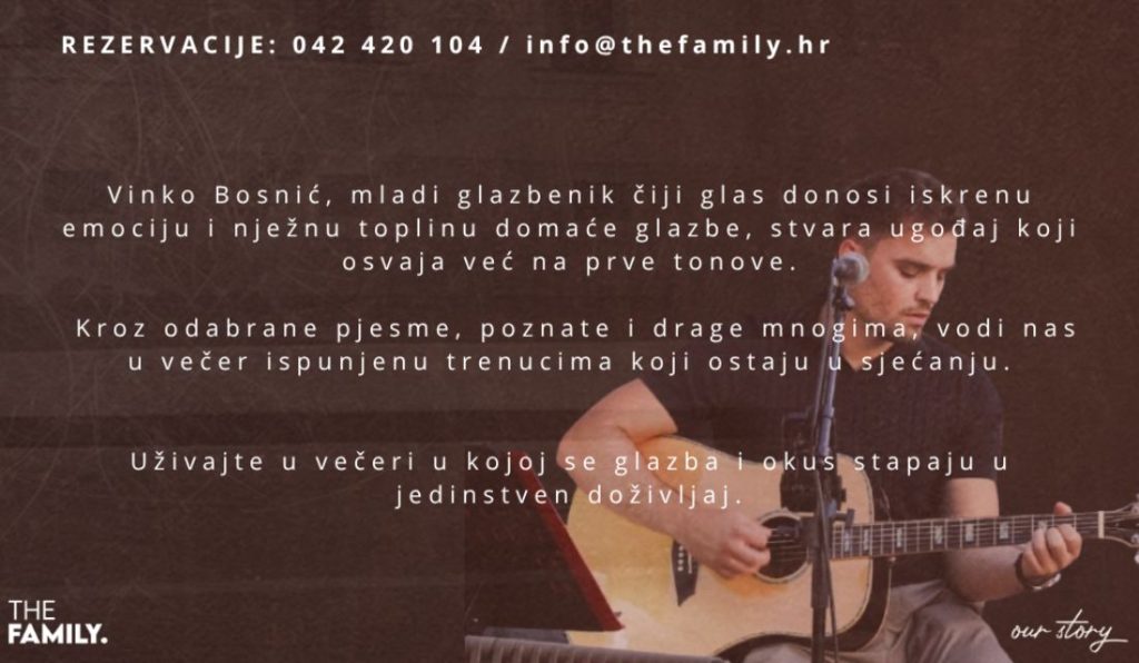 Ljubitelji dobre glazbe i ugodne atmosfere ovog će petka, 21. studenoga, doći na svoje u prostoru Brunch poznatog varaždinskog koncepta The Family. Od 19:30 sati održat će se Glazbena večer uz nastup mladog glazbenika Vinka Bosnića, čiji nastupi posljednjih godina privlače sve više poklonika.